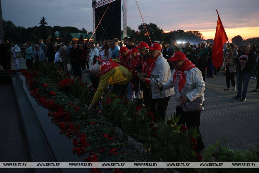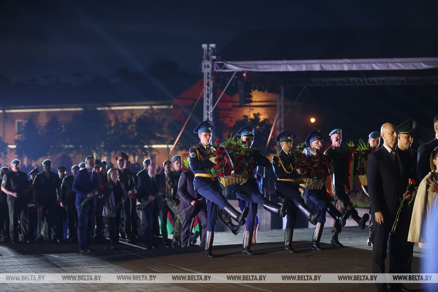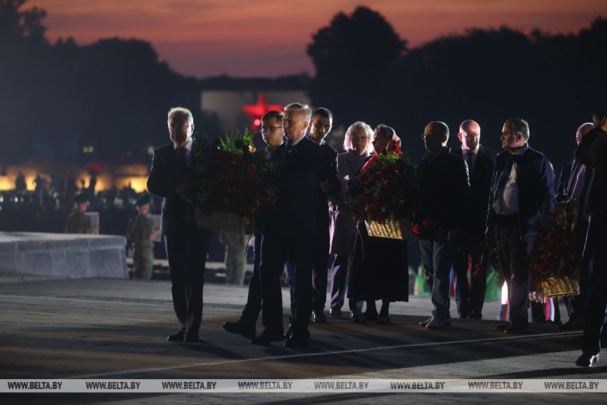 Члены дэлегацый, ганаровыя госці ўсклалі карзіны кветак да Вечнага агню і пліт некропаля. Мінутай маўчання ўдзельнікі мітынгу ўшанавалі памяць загінулых у баях воінаў. Звяртаючыся да прысутных, Аляксандр Вальфовіч адзначыў, што сёння як ніколі важна шанаваць мір на сваёй зямлі і рабіць усё магчымае для яго захавання. Дзяржаўны сакратар Саюзнай дзяржавы Дзмітрый Мезенцаў указаў на важнасць адзінства брацкіх народаў, без якога не было б і перамогі ў Вялікай Айчыннай.