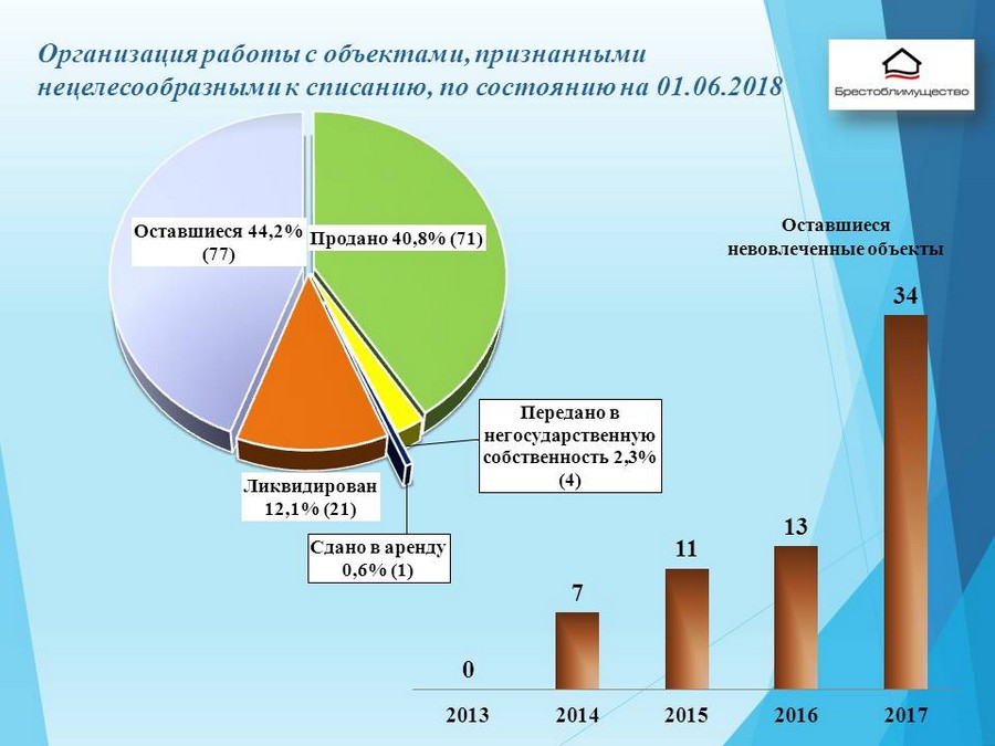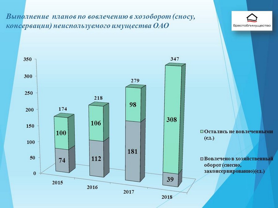 ход выполнения планов по вовлечению в хозяйственный оборот (сноса) государственного имущества, расположенного на территории области, а также имущества открытых акционерных обществ с долей Брестской области и ее административно-территориальных единиц.