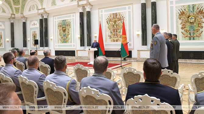 27 чэрвеня, Мінск /Кар. БЕЛТА/. Прэзідэнт Беларусі Аляксандр Лукашэнка ўручыў генеральскія пагоны вышэйшаму афіцэрскаму складу. Урачыстая цырымонія адбылася 27 чэрвеня ў Палацы Незалежнасці, перадае карэспандэнт БЕЛТА.
