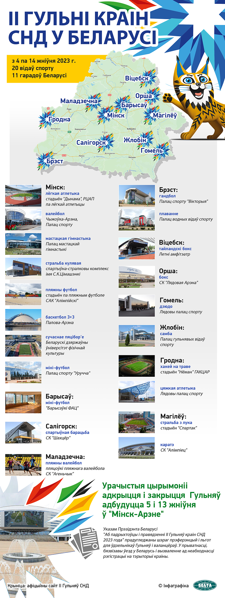 II Гульні краін СНД праходзяць у Беларусі з 4 па 14 жніўня па 20 відах спорту. У іх прымаюць удзел больш за 2,2 тыс. атлетаў, якія прадстаўляюць больш за 20 дзяржаў. Урачыстая цырымонія закрыцця пройдзе 13 жніўня ў "Мінск-Арэне".-0-