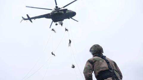 The servicemen landed from a Mi-8MTV-5 helicopter using climbing ropes and a special fast rope.