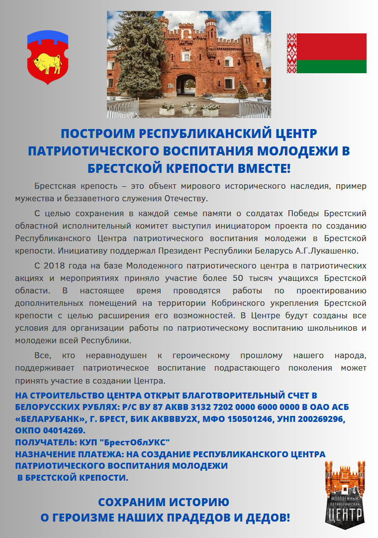 Построим Республиканский центр патриотического воспитания молодежи в Брестской крепости вместе!