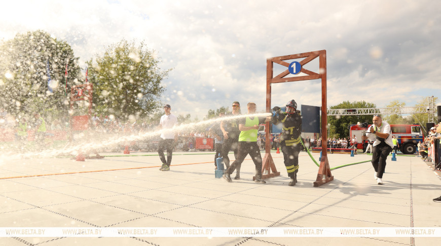 Турнир проходит на набережной Франциска Скорины. На соревновательной площадке установили учебную башню и комплекс тренажеров. На дистанции участникам надо преодолеть несколько этапов, среди которых "Подъем на башню", "Подъем рукава", "Силовой тренажер", "Прокладка линии" и "Спасение пострадавшего".