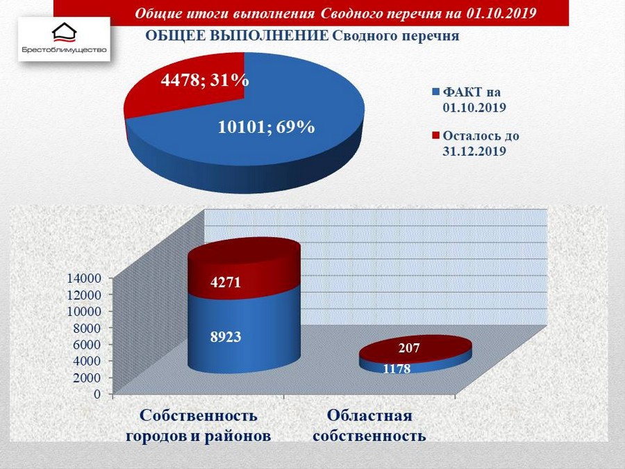 14 октября 2019 года председателем Брестского облисполкома Лисом А.В. при участии заместителя председателя Госкомимущества Абрамова В.А. проведено совещание с руководителями городских и районных исполнительных комитетов, органов управления облисполкома, а также других областных организаций по вопросу оценки хода работы по завершению государственной регистрации имущества коммунальной собственности. С учетом озвученной председателем комитета «Брестоблимущество» Манько П.П. информации об итогах данной работы в регионах Брестской области в ходе совещания обсуждены характерные для них «болевые» точки, требующие особого внимания и принятия дополнительных мер.