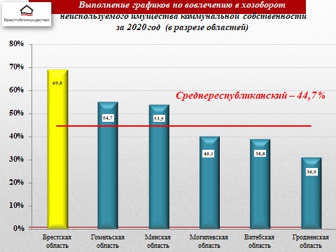 Председателем комитета «Брестоблимущество» Манько П.П. представлены основные используемые в Брестской области подходы, позволившие повысить результативность работы в 2020 г. и занять первое место среди областей с результатом 69% от плана по коммунальному имуществу.