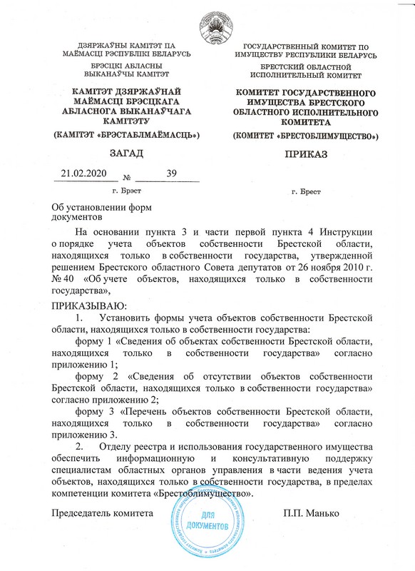 Формы учета объектов собственности Брестской области, находящихся только в собственности государства, определены приказом комитета «Брестоблимущество» от 21.02.2020 № 39.